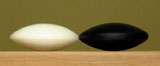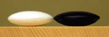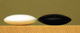 碁石の最高級品は白石(メキシコ産)がはまぐり貝から、黒石は那智黒石から作られた組み合わせで厚みの有るものほど高価です。黒石は白石より多少大きめに造られています。